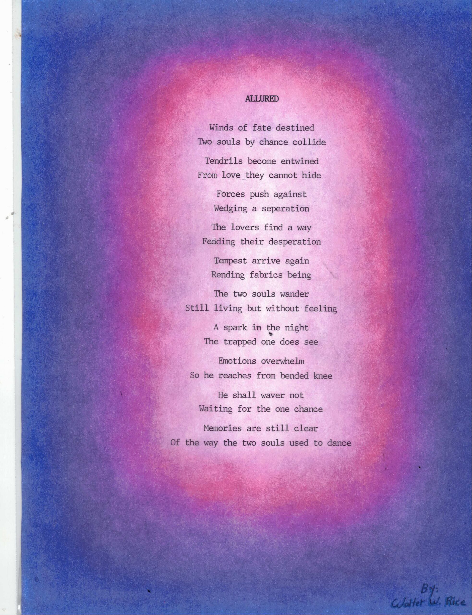 Poetry / Texas / Walter Rice (TX) Poetry and Art by Walter Rice October 21, 2022 Written by Walter Rice 0 Walter Rice Walter Rice Walter Rice poetry Further Reading... Poetry by Jose Gonzalez April 24, 2023 Poetry by Jojo Ejonga September 5, 2025 Poetry by Andrew Krosch December 8, 2025 No Comments Leave a Reply Cancel Reply Save my name, email, and website in this browser for the next time I comment. Δ Previous Post Your Pain(ting) Next Post This Cold Dark World