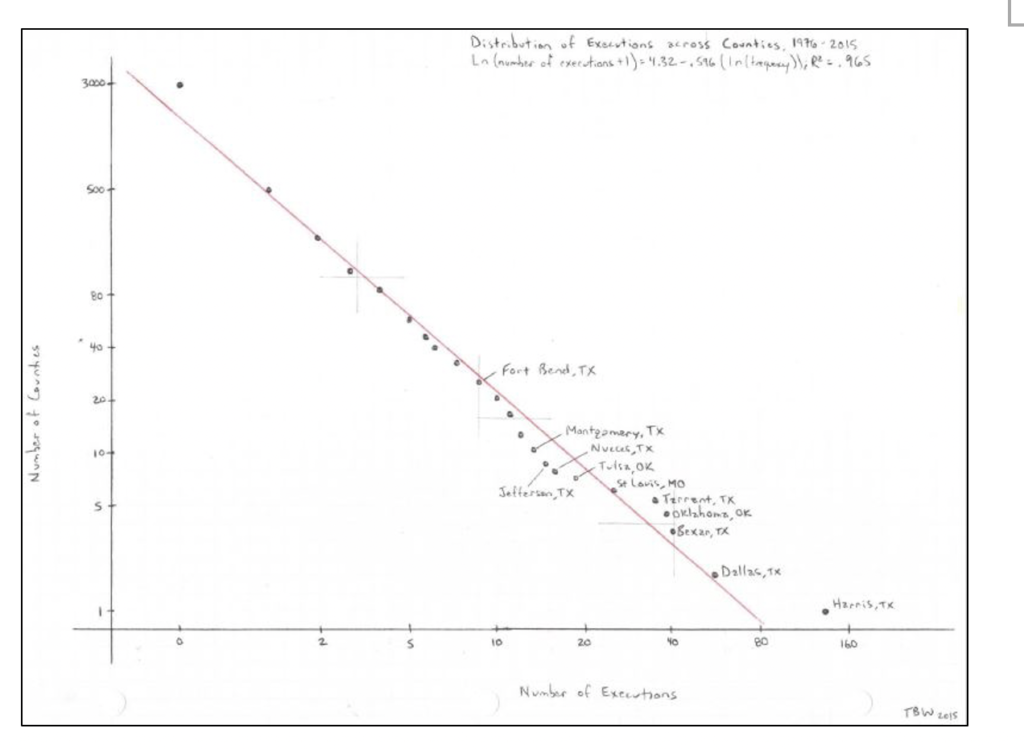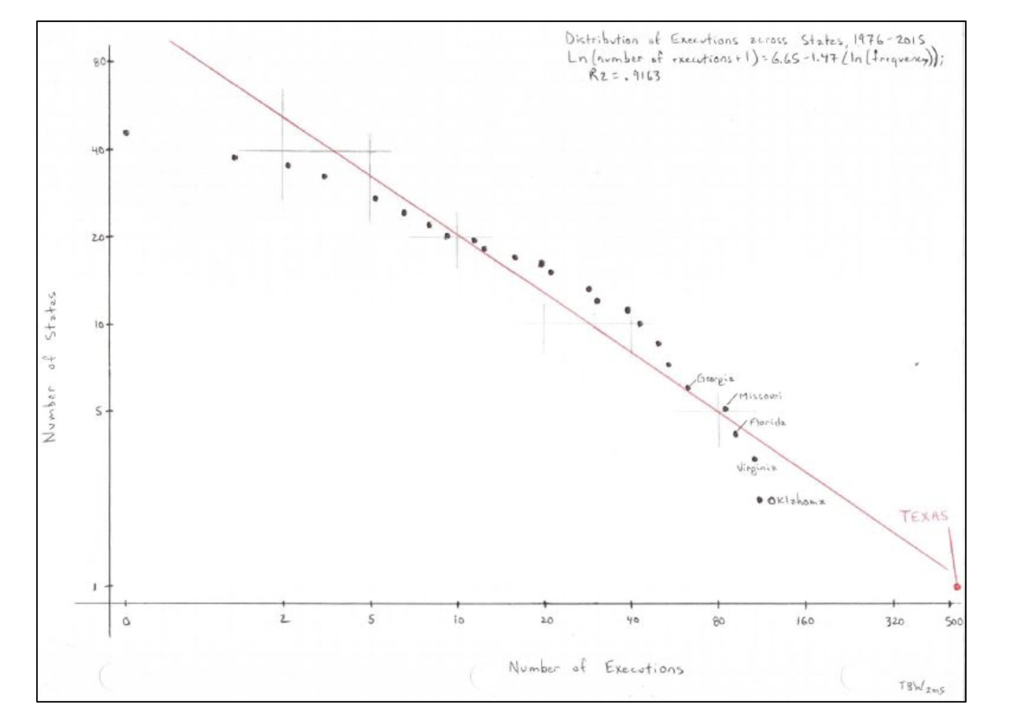 “Remember bell curves? A Laplace-Gauss distribution is the classic bell curve, a ‘normal’ distribution. According to standard central limit theorem, any process that generates this type of curve has to have some kind of error correction element inherent to it. Think about rolling dice: first, you roll high, you next roll low, or maybe high again; what matters here is that each throw – or sample – is uncorrelated. What you roll the first toss, in no way impacts the next, or the one after that. Now, think about death sentences. Obviously, some jurisdictions are going to experience more especially gruesome murders than others, and there is no reason to expect that the relationship between homicides and executions would be exact or perfect. And yet, given all the variables, random fluctuation would strongly suggest that a normal distribution would explain the imperfections in this relationship. In other words, there would always be spikes here and there across the map, but, over time, the relationship between murders and executions should level out when controlled for factors like population density, poverty, and firearm ownership.”