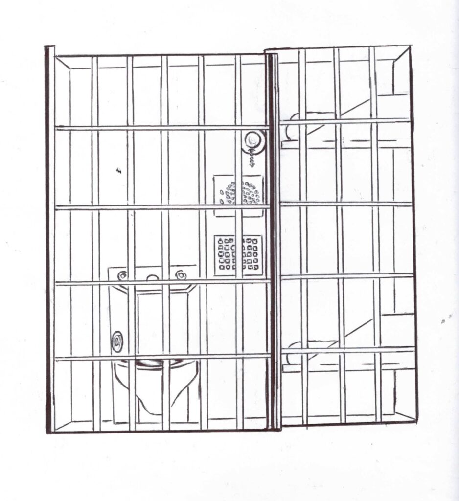 The staff at Ellis had not received the same memo, apparently. After schlepping my bag and mattress up two flights of stairs, I located my cell — which was closed shut. I had been assigned to the bottom bunk, and I could see through the bars that this was in fact empty. I saw a mattress and a few odds and ends belonging to my cellie. The man himself was absent, however. The cell was one of the old styles, meaning: six by nine feet, i.e., very, very small. They’d replaced the old porcelain toilet with a stainless-steel sink/toilet combo. That was the only amenity. Of desks or shelves, none were to be seen. We didn’t even have a light bulb in the fixture, I noted. It wouldn’t take me long to figure out why, alas. (Below is a simple drawing of what the cells look like when seen from the front. There’s not much there, because in reality that is all there is. My thanks to WestSide Los for the art.)